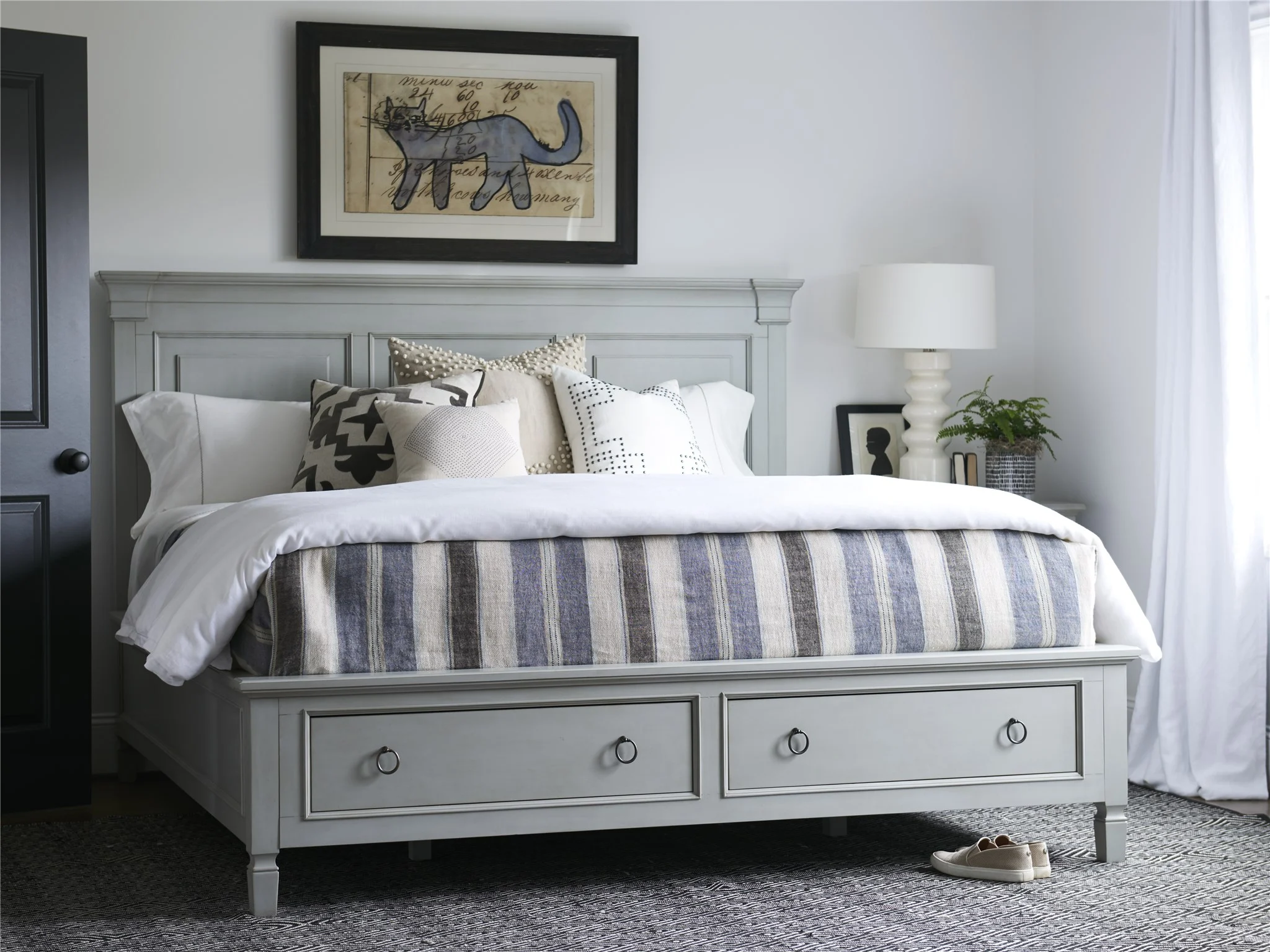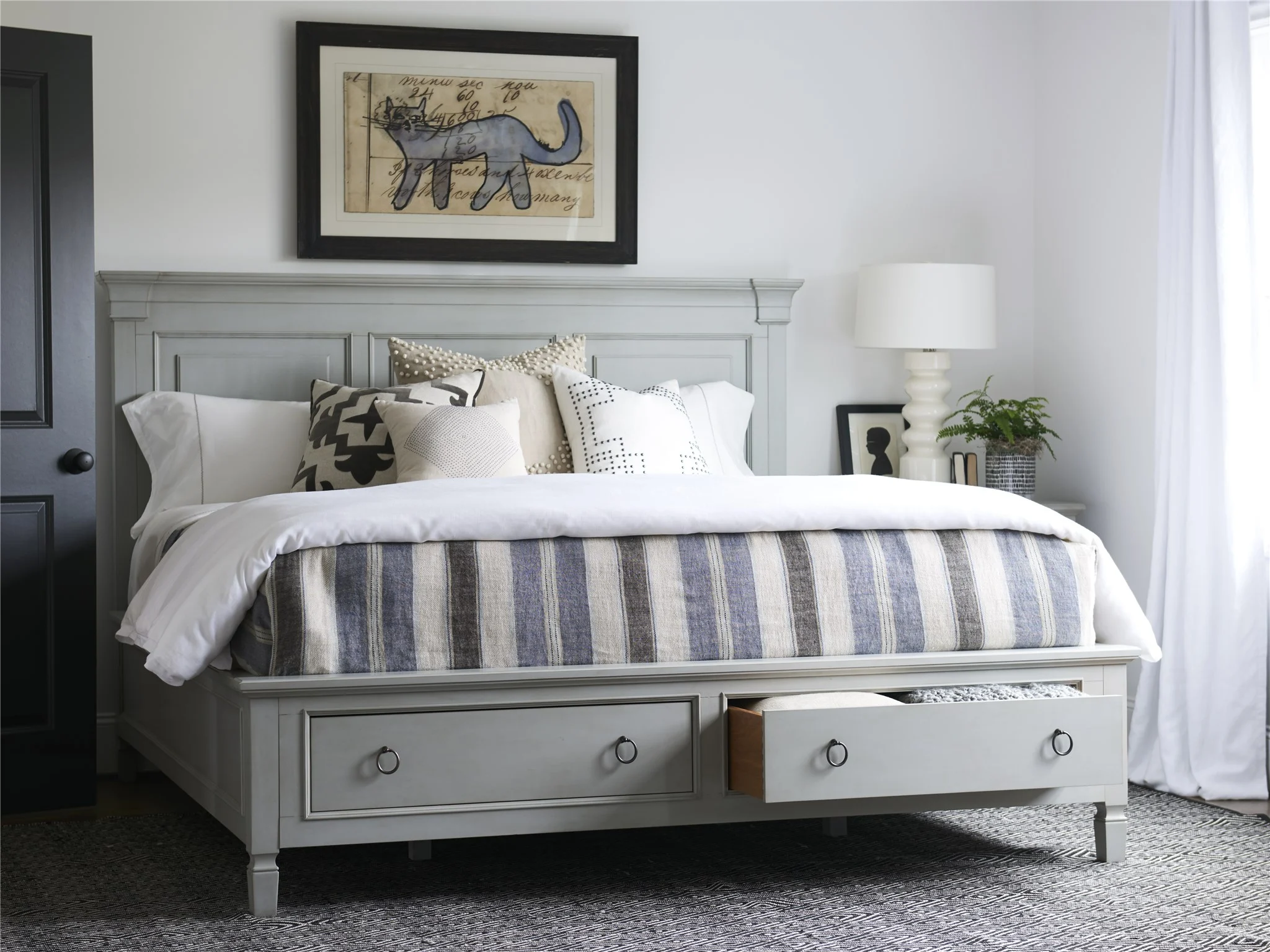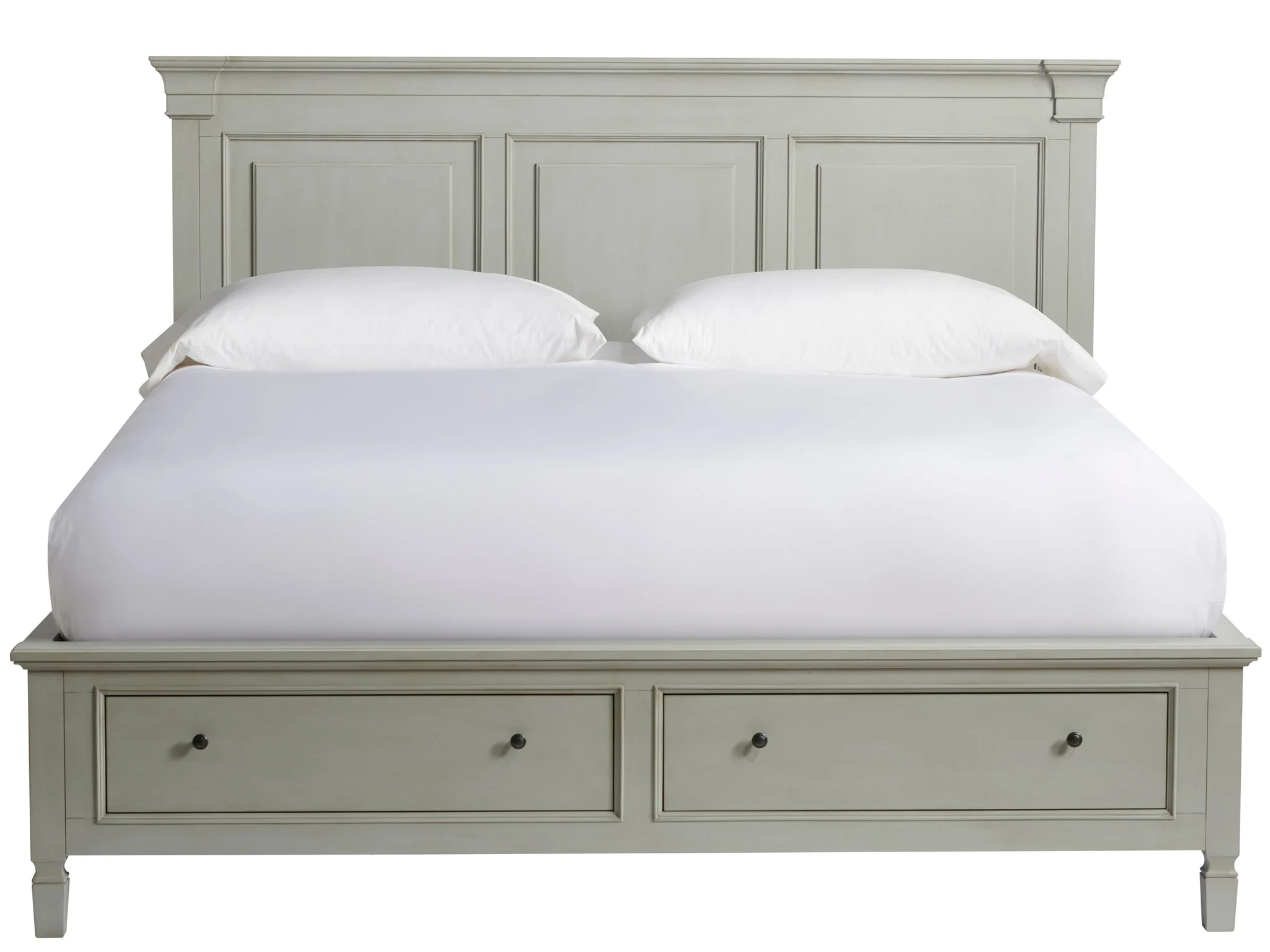 Showcasing stunning panel detailing and a soft gray finish, the Summer Hill Storage King Bed offers premium style and convenience with two pull-out storage drawers.
