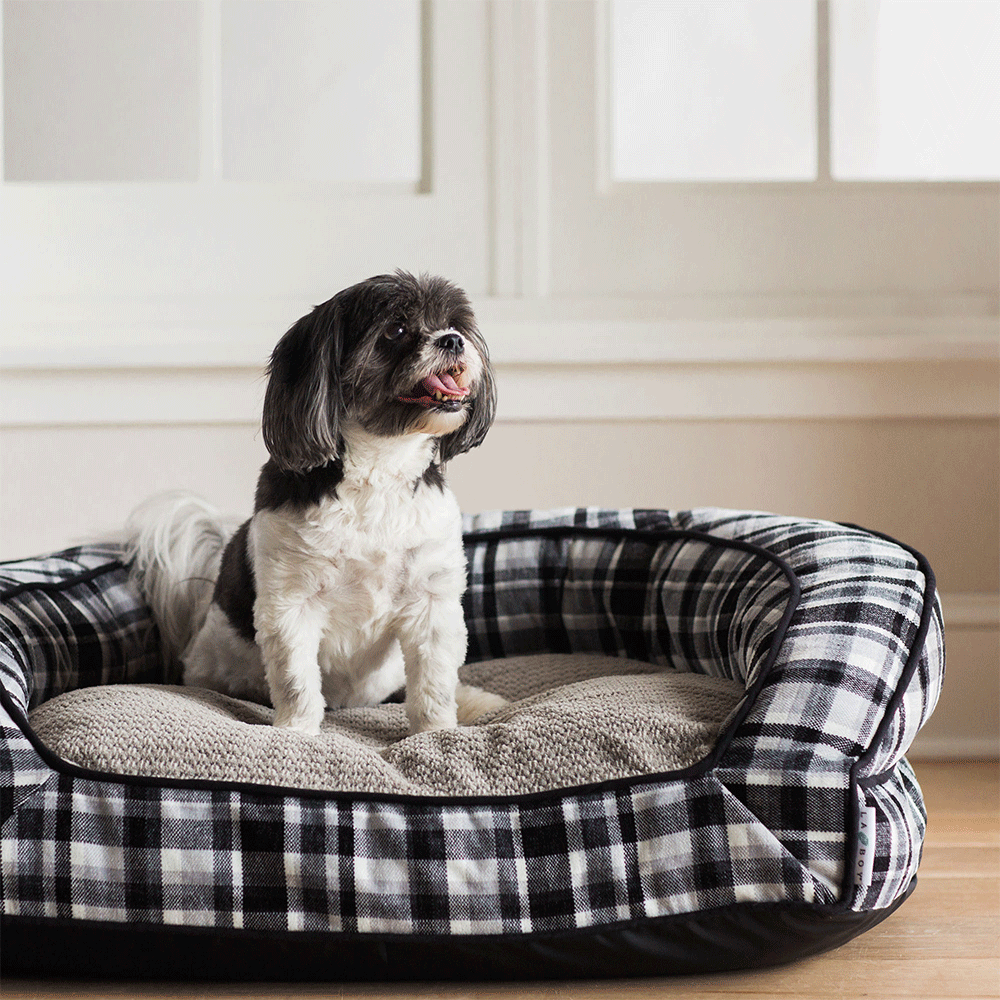 Cool and classic, the La-Z-Boy® Tucker sofa pet bed is a classic design for medium-sized dogs. Offered in a black and white plaid chenille with coordinating gray plush sleep surface, the Tucker pet bed will add style to any room of the home. Both options feature two rows of accent piping for added tailoring. The gusseted base is overstuffed with Comfort Signature Blend™ foam, a mixture of a conventional and memory foam while the sofa-style bolster is filled with Comfort Select™ fiber fill, a human grade premium fiber with never-flat properties. The La-Z-Boy Tucker Sofa Bed caters to dogs with three different sleep styles. The Donut position is the most common sleeping position as it conserves body heat and makes dogs feel protected and reserved. Dogs who sleep in The Donut position usually have gentle, easy-going, sweet personalities and sleep well on any bed – especially cuddlers and loungers with walls to help keep body heat locked in. Side sleepers tend to have happy-go-lucky and fiercely loyal personalities and are peaceful and comfortable with their surroundings. They sleep well on many types of beds: bolstered or non-bolstered. Dogs who sleep in The Sprawl position are confident and secure with themselves and their environment and tend to have independent personalities. These types of sleepers sleep well on pillows, sofas, and loungers.