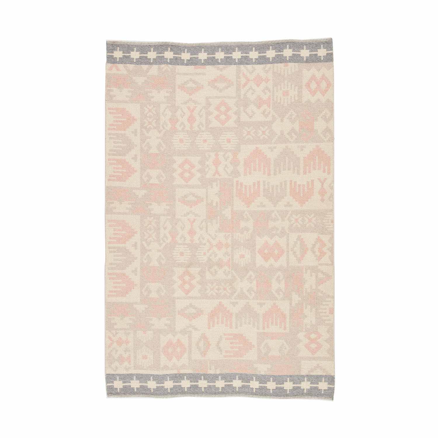 This kilim-style rug takes its inspiration from ancient Turkish carpets, but modern materials make this a rugged beauty that can withstand kids, dogs, and heavy traffic. Stain, dirt, and weather resistant, this easy-care option is made in India of 100% PET yarn (recycled plastic bottles) that makes it exceptionally durable and long-lasting. A refined pattern displayed in soft, petal-hued tones makes this a fresh addition to any space—indoors or out. Rug pad recommended.