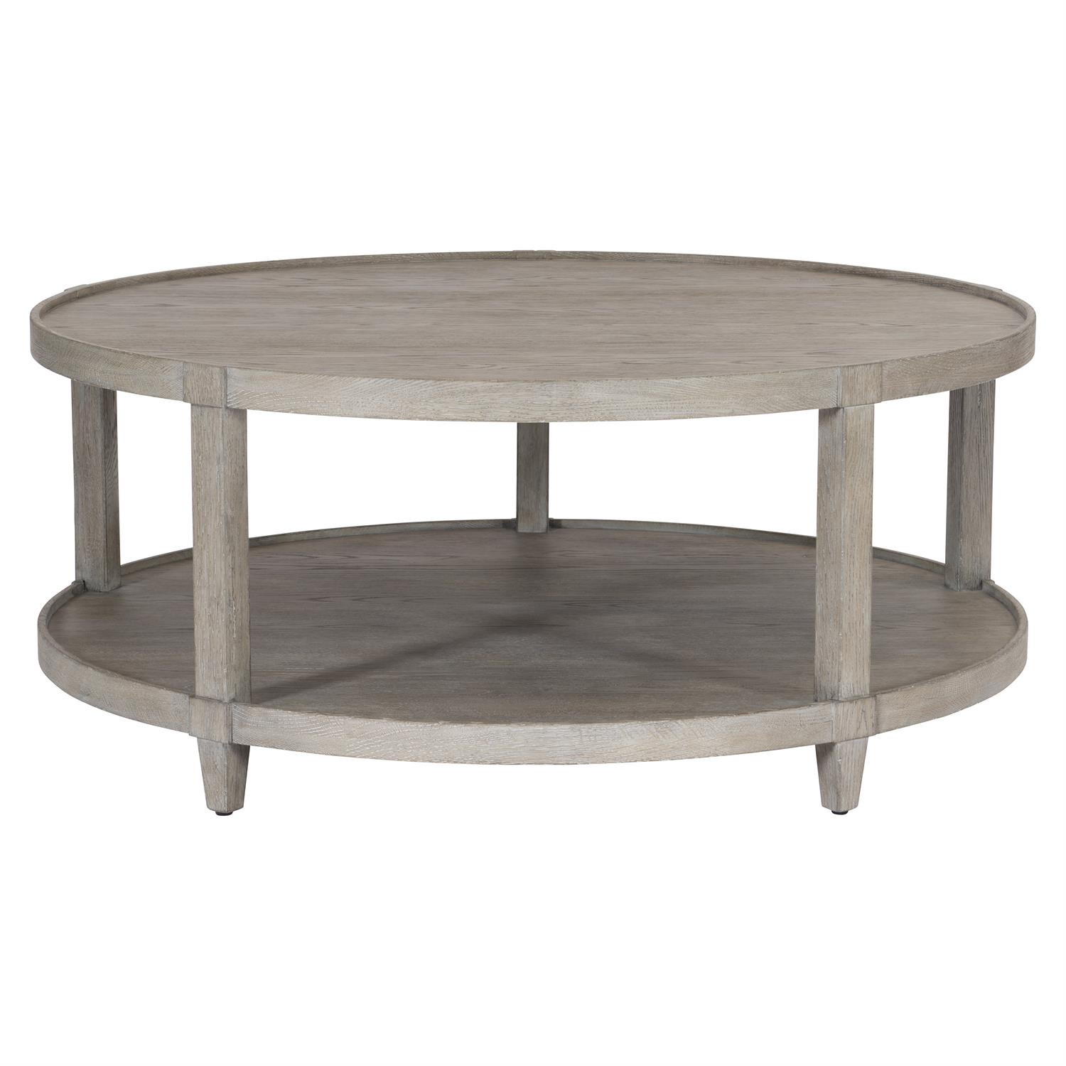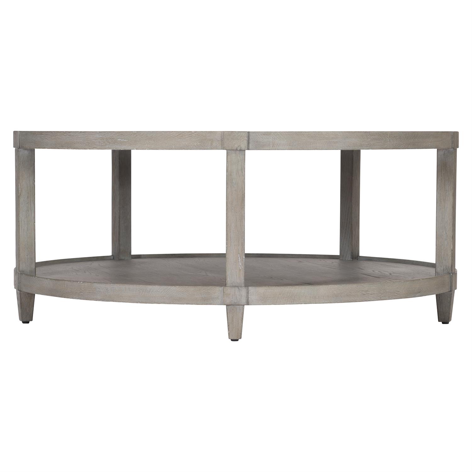 A two-level round cocktail table highlights a subtle formality with a weathered finish on knotty white oak.