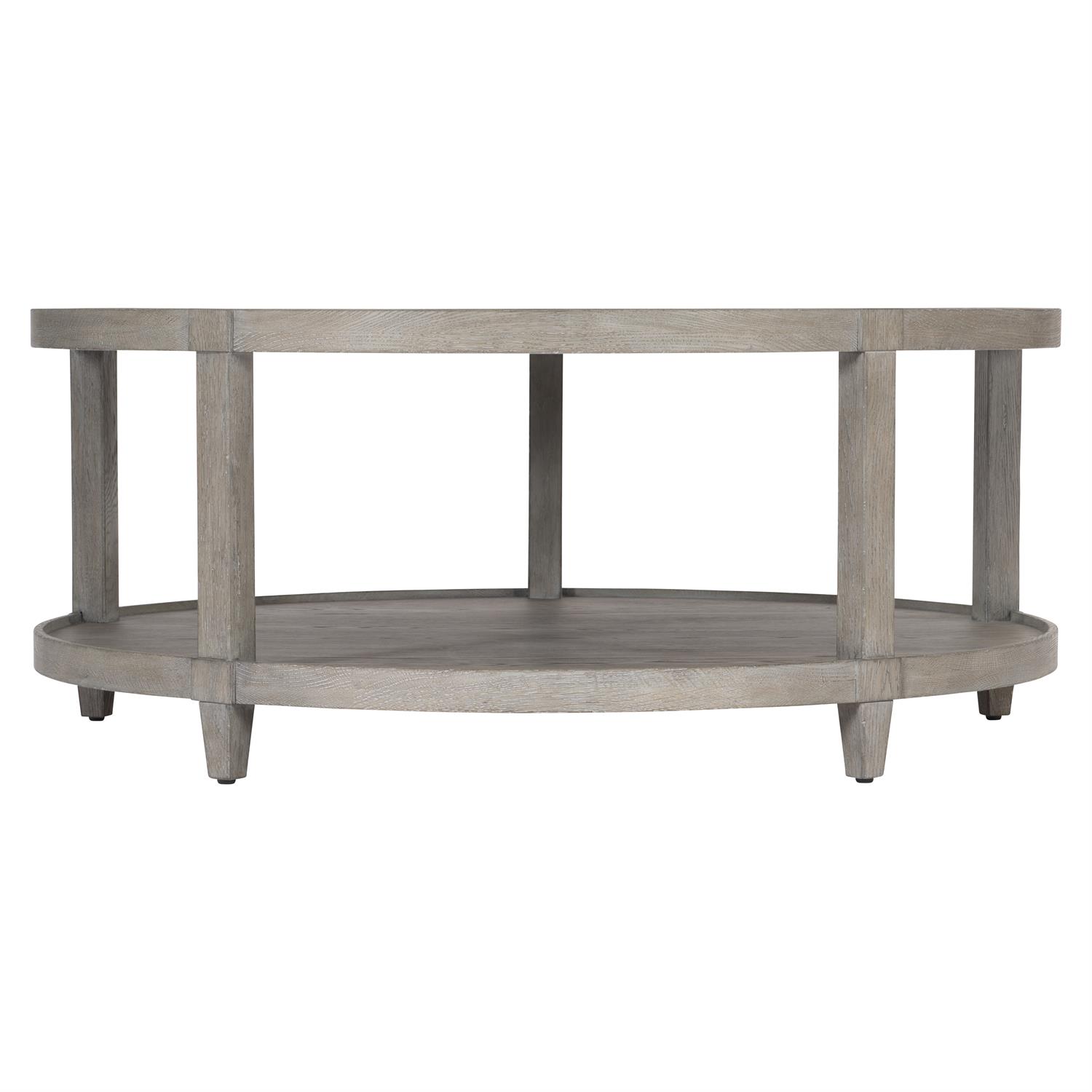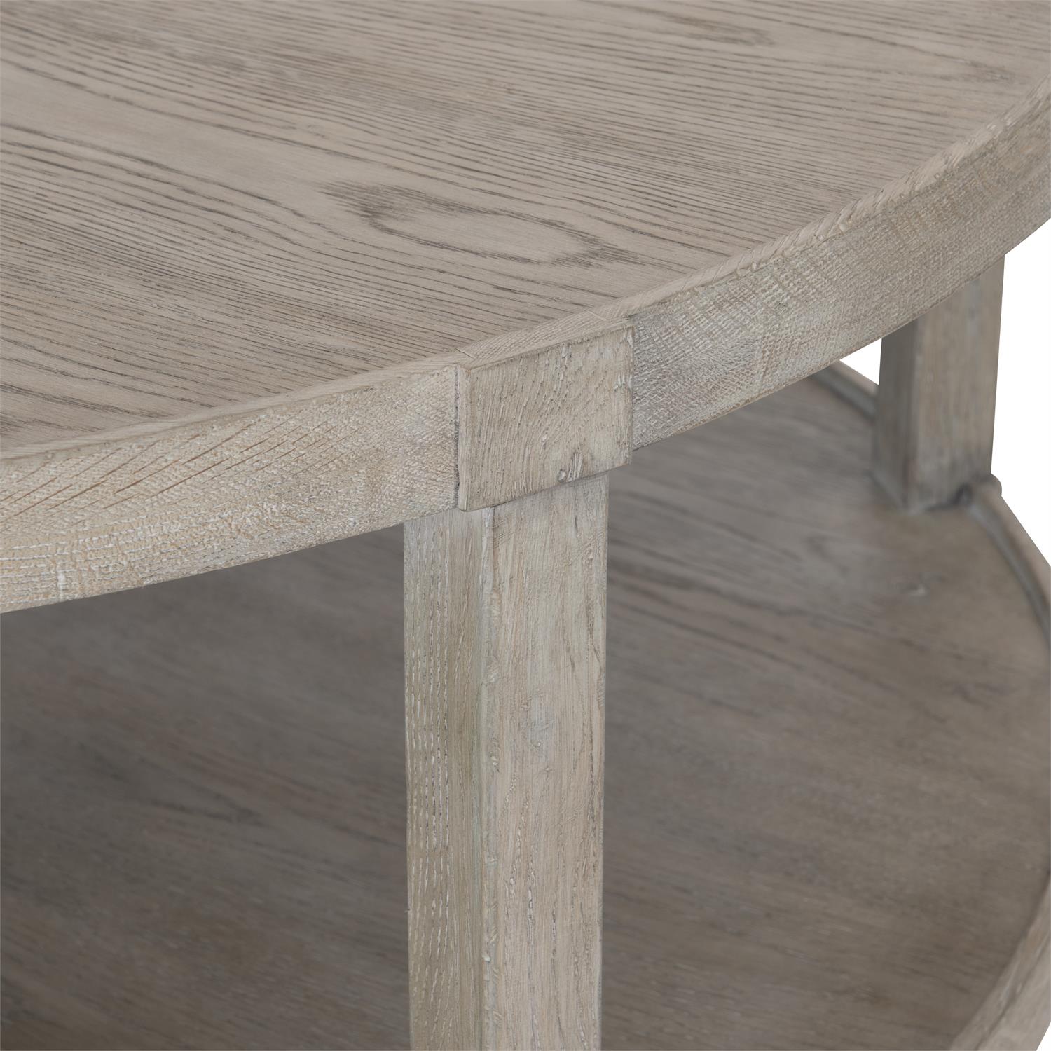 Two sweeping circles in the Albion cocktail table are joined with tapered legs to create a casually elegant cocktail table. The texture of cerused oak and a layered Pewter finish create the look of history and weathered wood. A band of wood around the top and shelf offer a traditional gallery design in a simpler form.