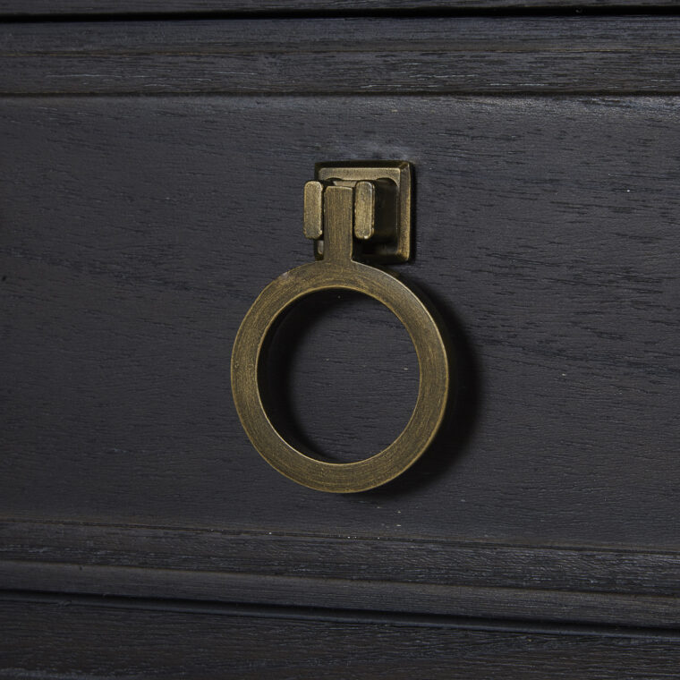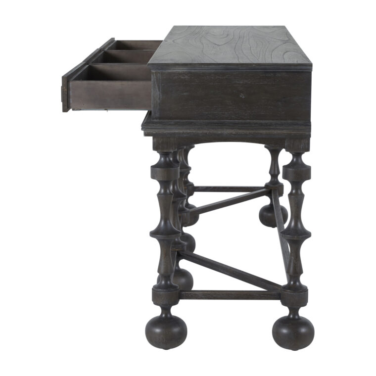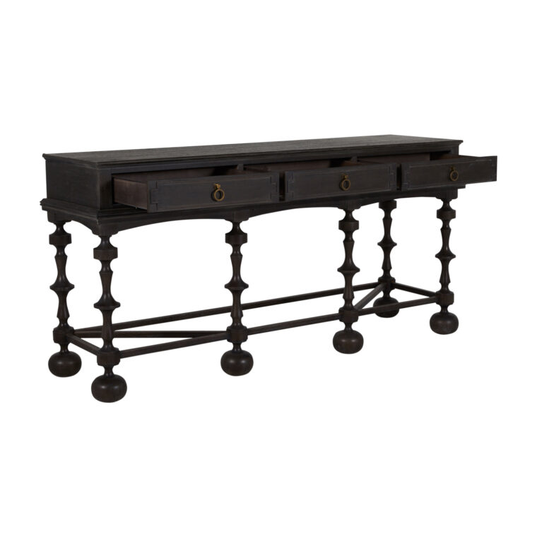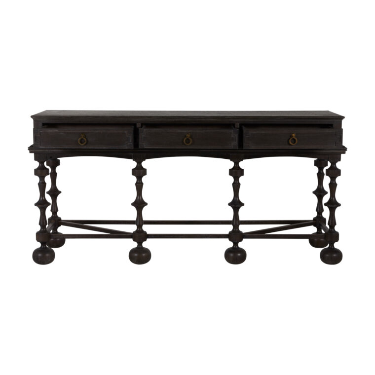Reminiscent of vintage furnishings but with updated detailing, this antique-inspired console features a similar base as the Arrington Cabinet. Three drawers offer generous storage in an eye-catching showpiece. Features undermount soft-close drawer glides. Materials: Rubber Wood, Mindy Veneer, Iron Finishes: Cerused Ash, Antique Brass Overall Dimensions: W76 x D22 x H37.25 Weight: 257.49