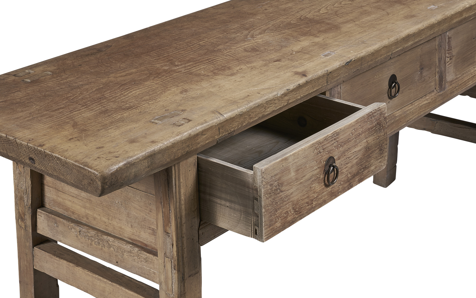 Antique frames and reclaimed wood are used to fashion this found three drawer butcher table. Each table is unique and measurements shown are approximate. All pieces will vary in design and size. Item Weight95