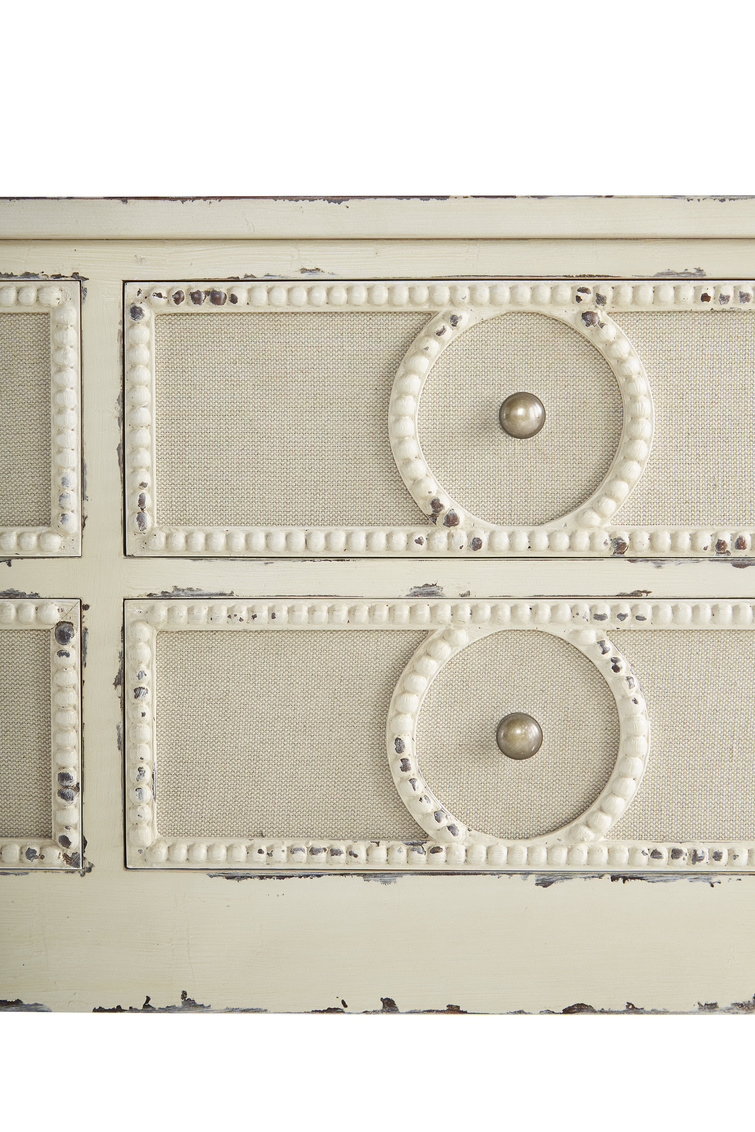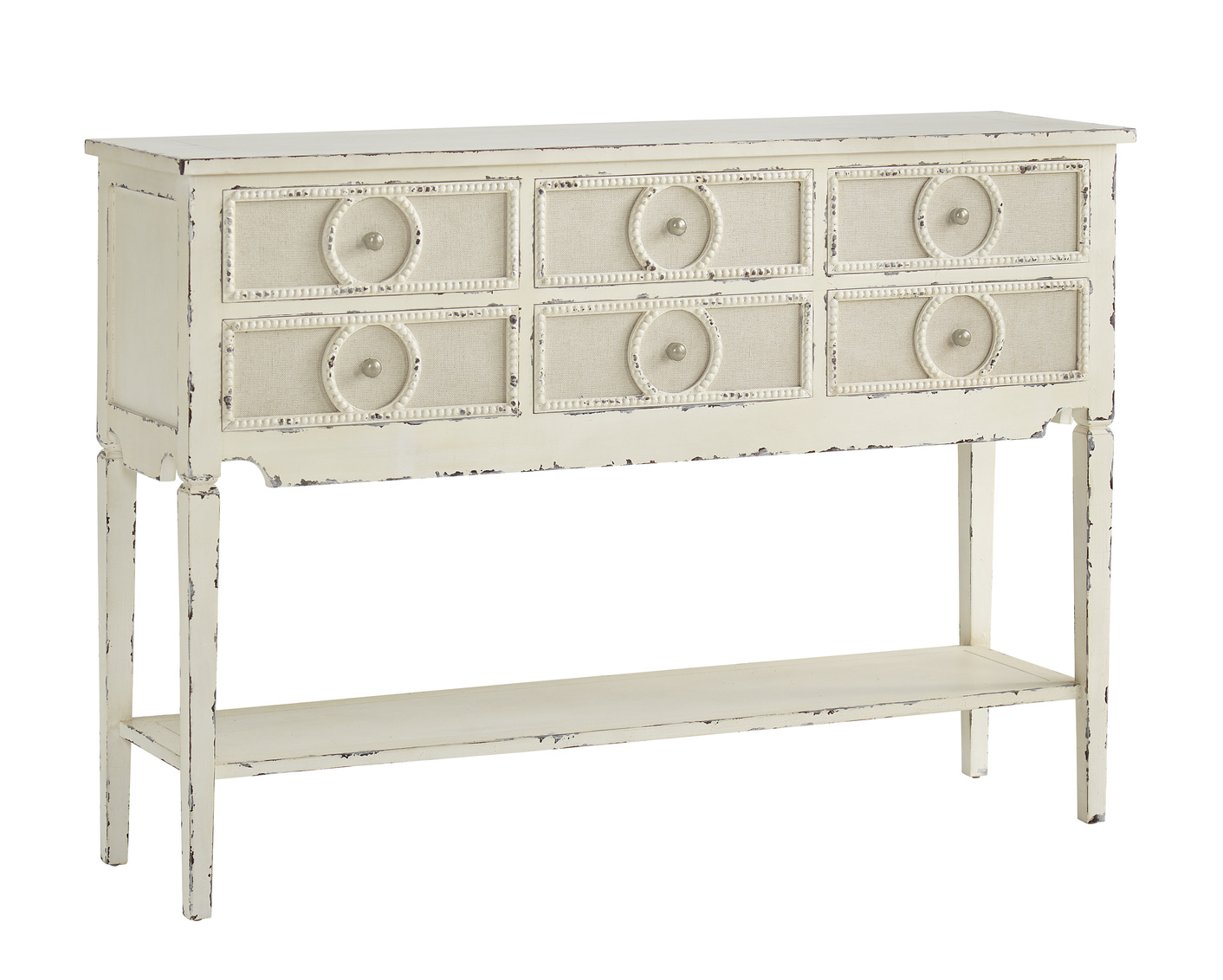 Vintage veracity abounds in this charming console. From the tapered legs to the exaggerated bead detailing on the drawers, your guests will be hard pressed to discern that you have not been shopping the estate sales! Six drawers and a useful lower shelf make this a practical choice for your home, while the antique styling combined with the updated touch of linen on the drawer fronts make this a very stylish choice as well. Item Weight134