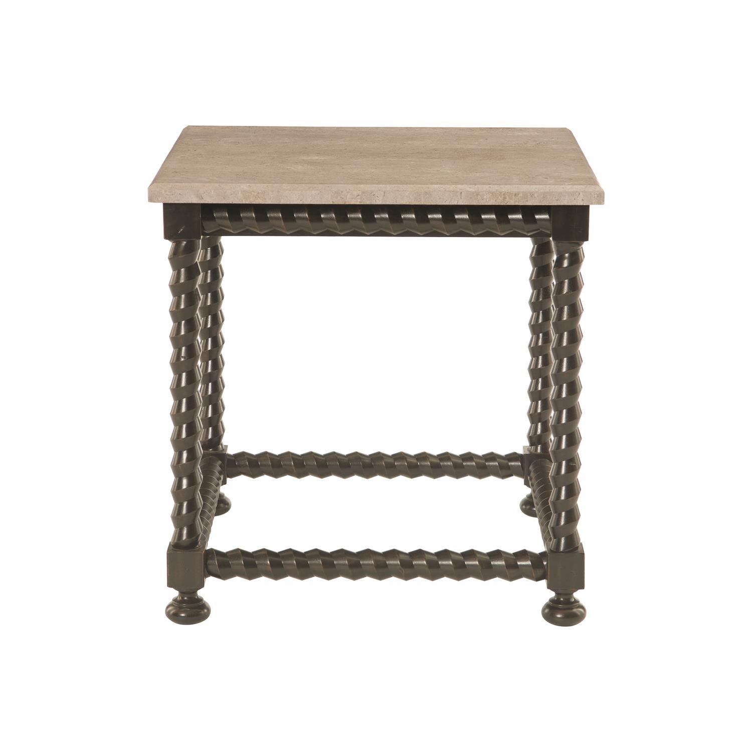 Impeccably crafted, the Cordova end table is a unique piece that brings a chic, polished look to an interior. A modern update on a style popular in the early Baroque period, the spiral wood base creates visual interest and a sense of movement. A rich ebonized finish provides a contrast to the travertine, further enhancing the appeal of this eye-catching design.