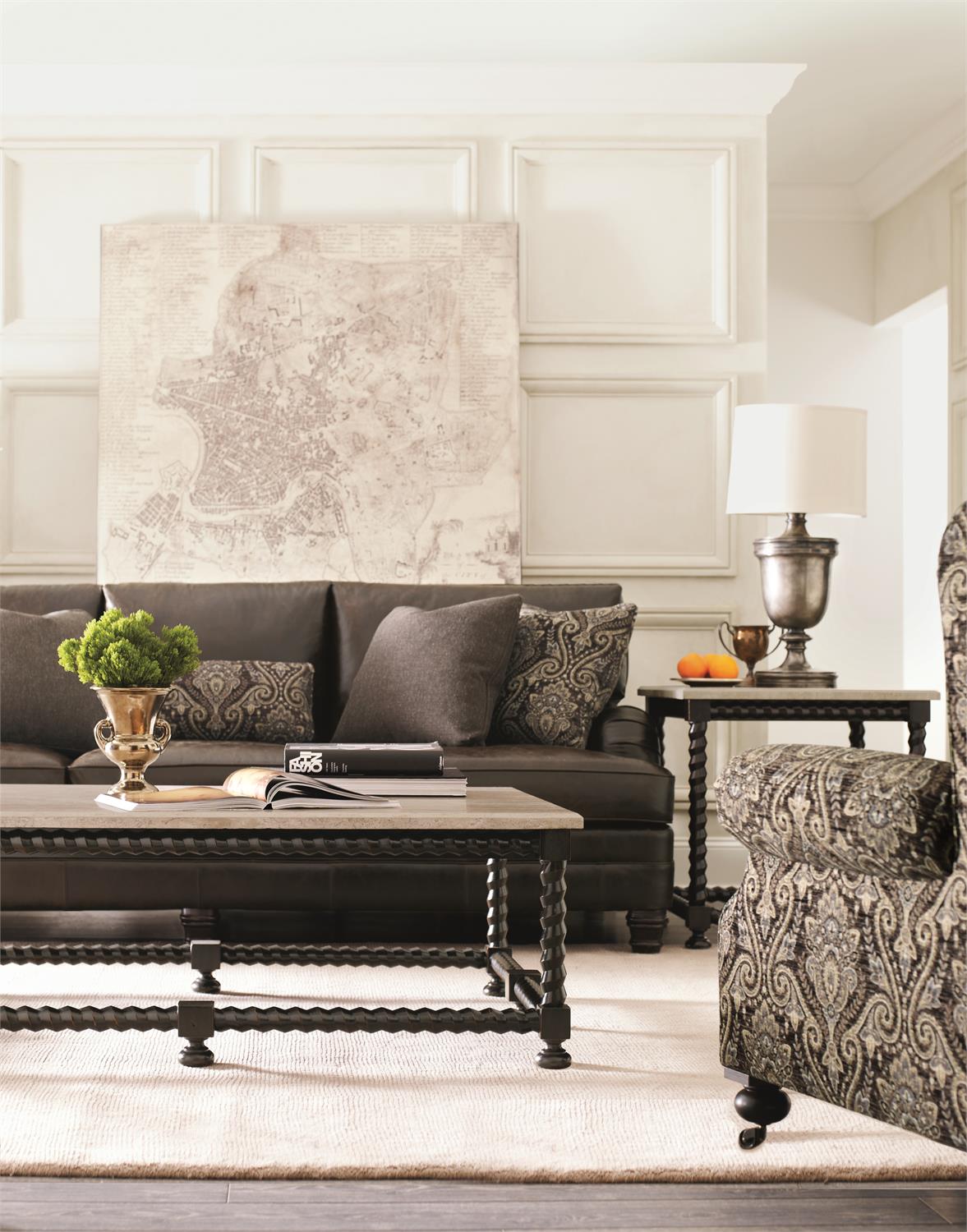 A shapely spiral base in a rich ebonized finish draws the eye to this engaging end table.
